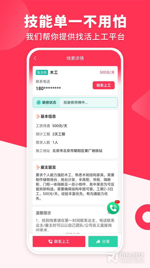 3、为工人提供客户沟通功能,帮助工人和用户实时沟通、交流,加快工程进度。