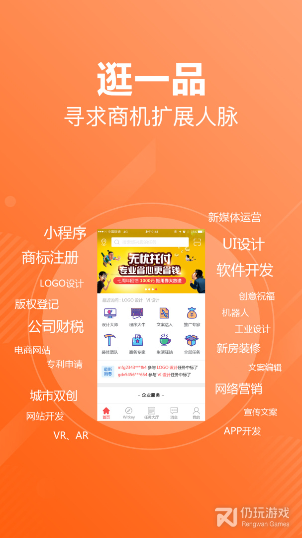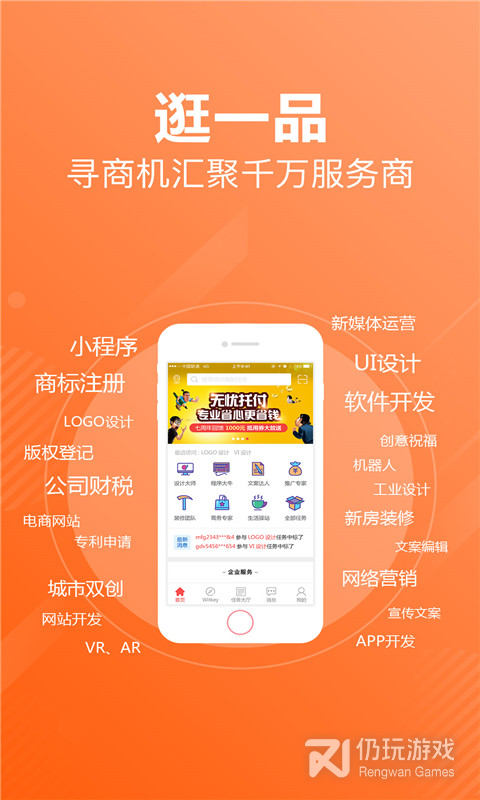 4、提供设计、开发、文案、装修、营销等多种分类任务,包括LOGO设计、网站开发、VI设计、文案策划、装修设计、APP开发等