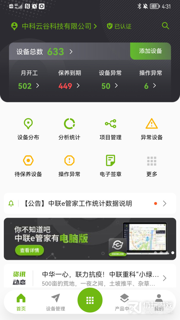 中联重科-中联e管家,APP是一款高端智能设备管理软件,创新性的为工程机械用户提供智能、便捷的设备、经营管理,具体功能包含:设备综合管理、项目设备管理、配件/主机销售咨询、设备维修指南、设备电子围栏、行业资讯等功能。