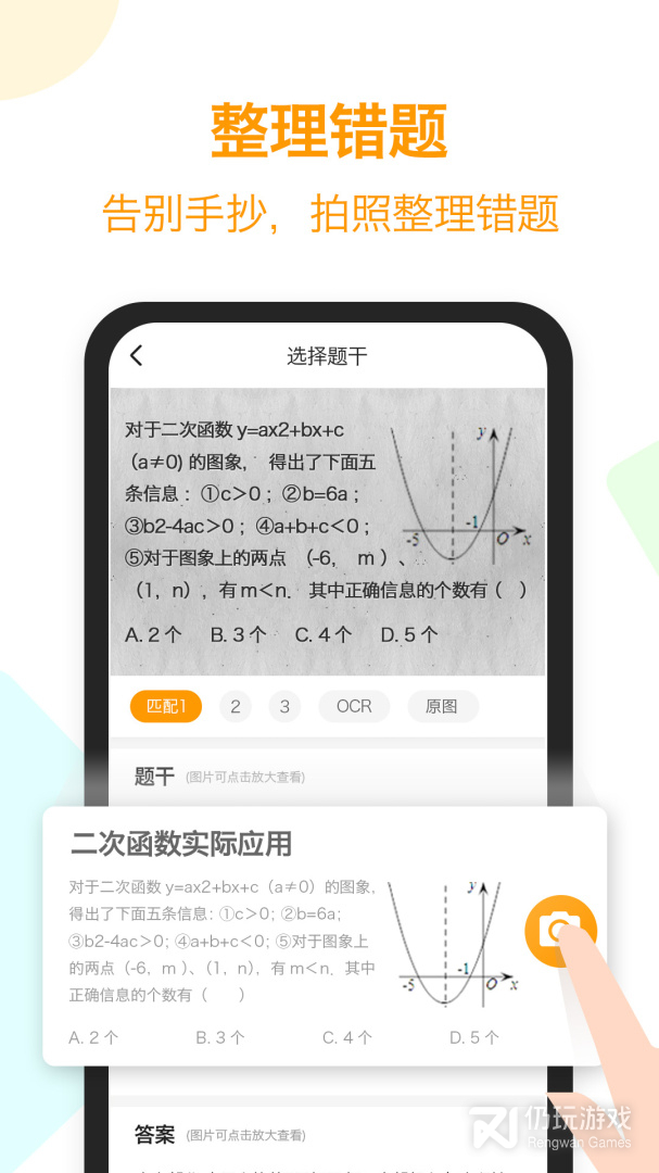 1、拍照搜题:软件通过图像识别技术,拍照、截图或者输入文本录入错题