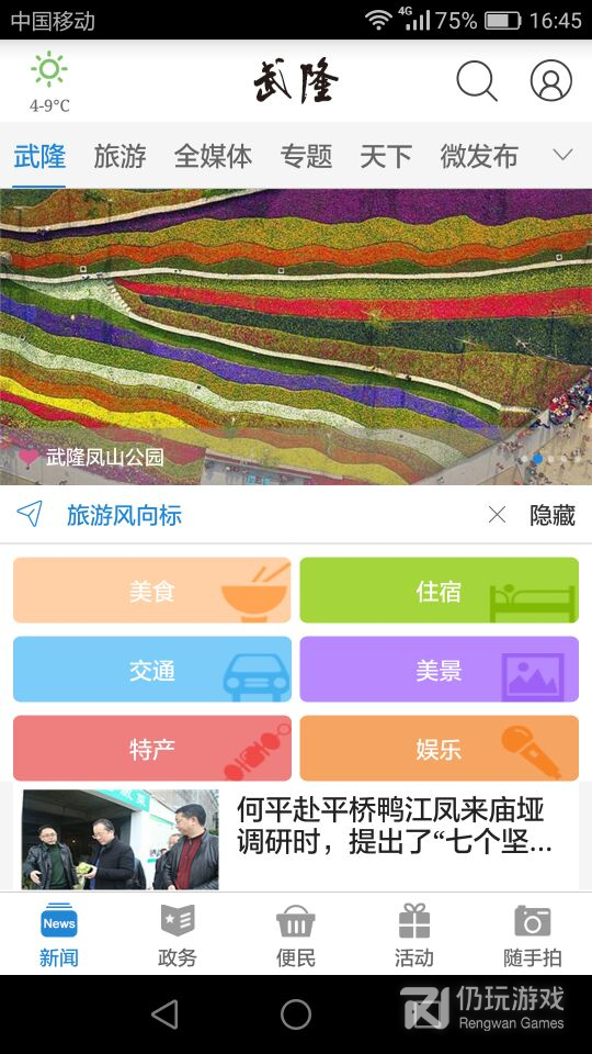 武隆报社承办,是基于智能手机的移动应用程序。以武隆资讯服务为基础,整合新闻、政务、旅游、便民、问政、活动等内容,为用户提供优质、便捷、权威的服务。重视服务对象的体验与交互,降低了用户服务门槛,提高了政府的公信度和影响力,新闻中心各栏目中插入了旅游类的资讯栏目,从该栏中能看到本地值得去旅游的地方,通过这些信息可以安排好自己周末的旅游出行目的地