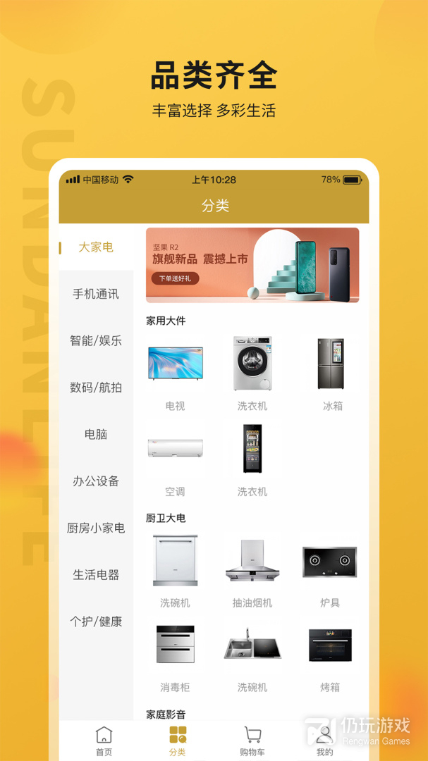 该软件覆盖范围很广,包括但不限于电脑数码、生活必需品、汽车产品、家用电器、厨房餐具、美容护理、家具、家纺等;