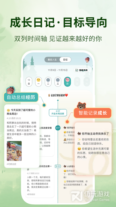 「重启人生计划」:进入日记页即可解锁为你量身定做的重启人生计划,每天都有新主题和生活小任务,成长也可以很轻松!
