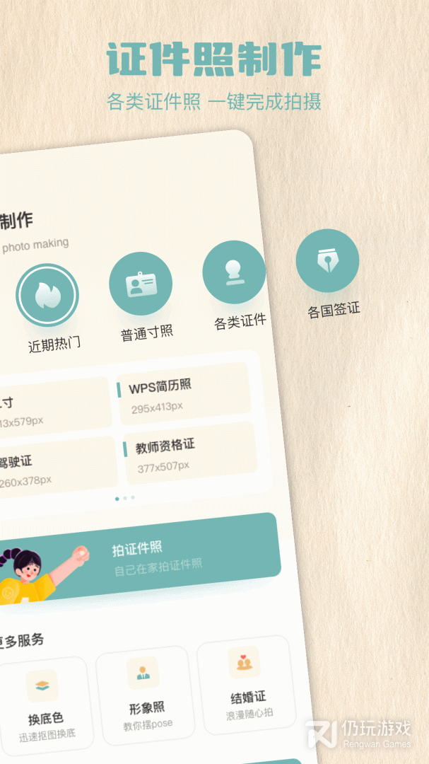 换底色一款简单、专业的证件照制作软件!可以把普通手机相机拍的照片修图成专业证件照,不会p图也能制作专业证件照啦。目前软件适配了很多专业尺寸,其中有一寸证件照、两寸证件照,军人证件照、英语四六级考试证件照,招聘证件照,简历证件照、找工作证件照,计算机等级考试、教师资格证考试、各国签证证件照,社保医保证件照等,几百种需要拍摄证件照的场景,让您拍出最美证件照!