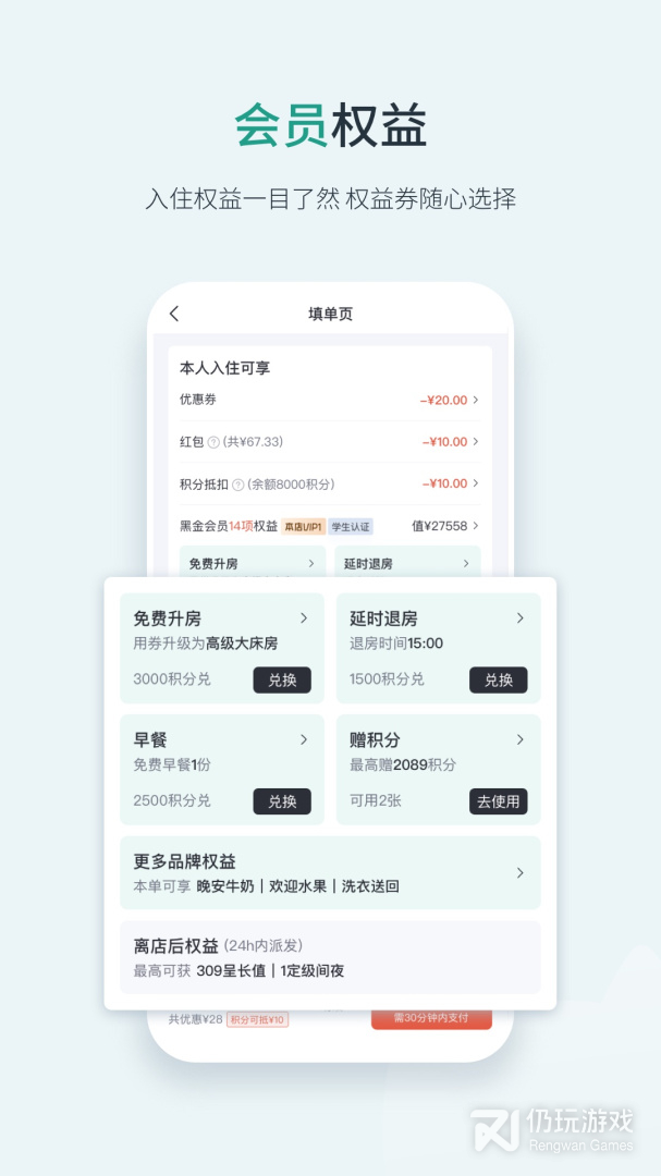 -会员积分: app订房可享受额外积分,积分可换免费房。