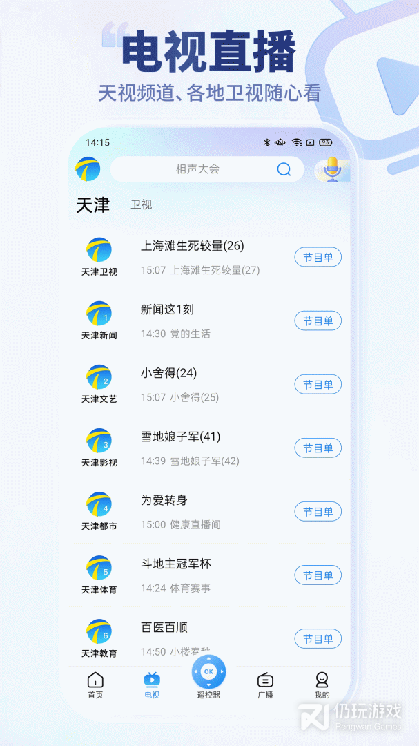 App中包含天津电视台11路直播频道,吉林10路直播频道,天津广播收音机,且支持48小时节目回看、直播节目预定、点播视频资源搜索、视频分享等功能。