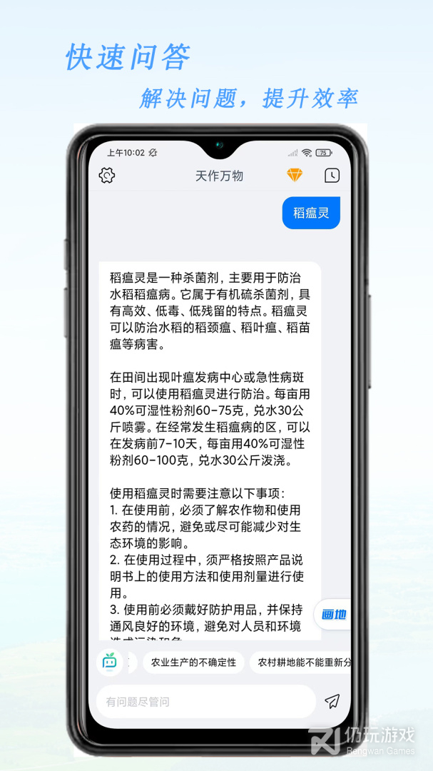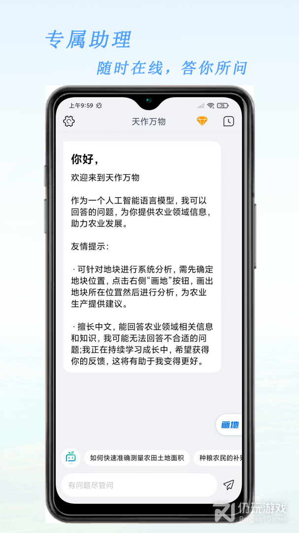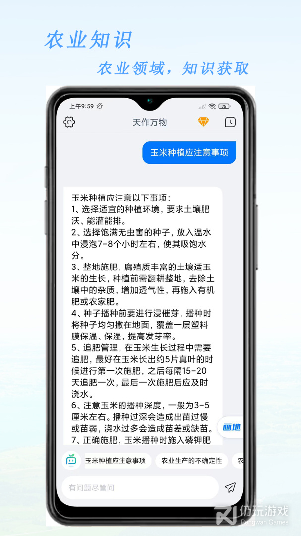 3、天作万物作为农业领域的人工智能创作助手,具有丰富的功能和服务,能够为用户带来更加智能化和高效的农业管理和规划体验。无论是在农业生产、管理还是销售方面,该app都能够为用户提供全方位的支持和帮助