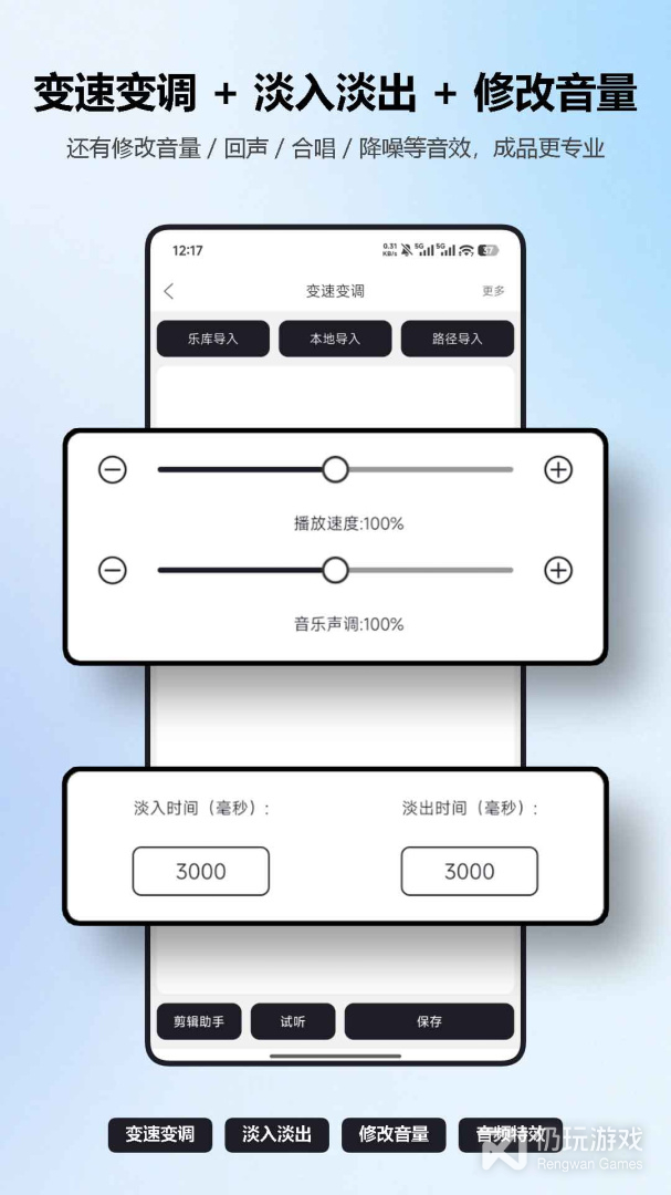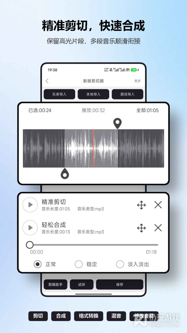 2、mp3剪辑器APP,具有音频剪切、合成、格式转换、混音、改变音量、变音、淡入淡出、录音、视频转音频以及修改音频信息等功能,是您手机上的万能音频编辑器