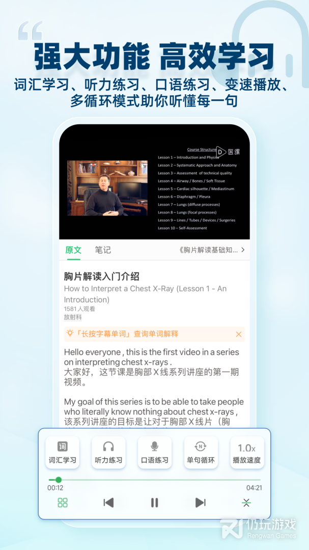 3、智能触屏查询医学词汇医课支持智能识别字幕中的单词,通过该词的拼写、音标、读音,结合常用搭配甚至例句,初步掌握词汇基本释义;以同根词为基础,通过牢记少量根词,掌握大量词汇