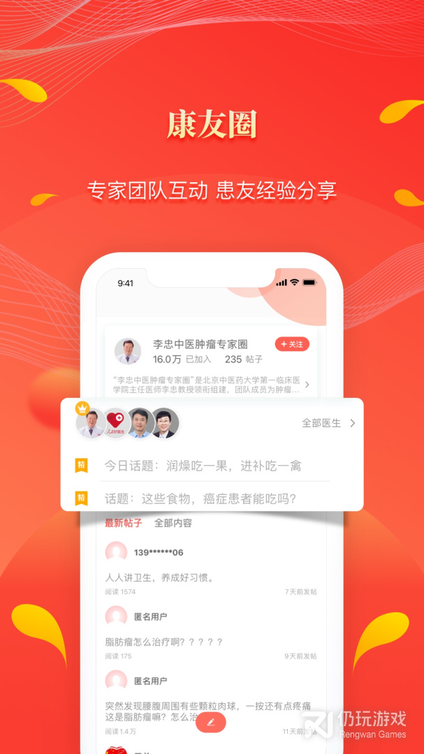 1、你可以在平台上咨询各种科室的医生相关健康问题。人民好医生app还提供了各种生活小疾病的话题,可以让你了解许多健康知识。平台依托于全国三甲医院专家资源,实现"大专家讲科普"、"名医直播互动"、"医患互动康友圈"等功能,同时提供全方位全周期的健康管理服务