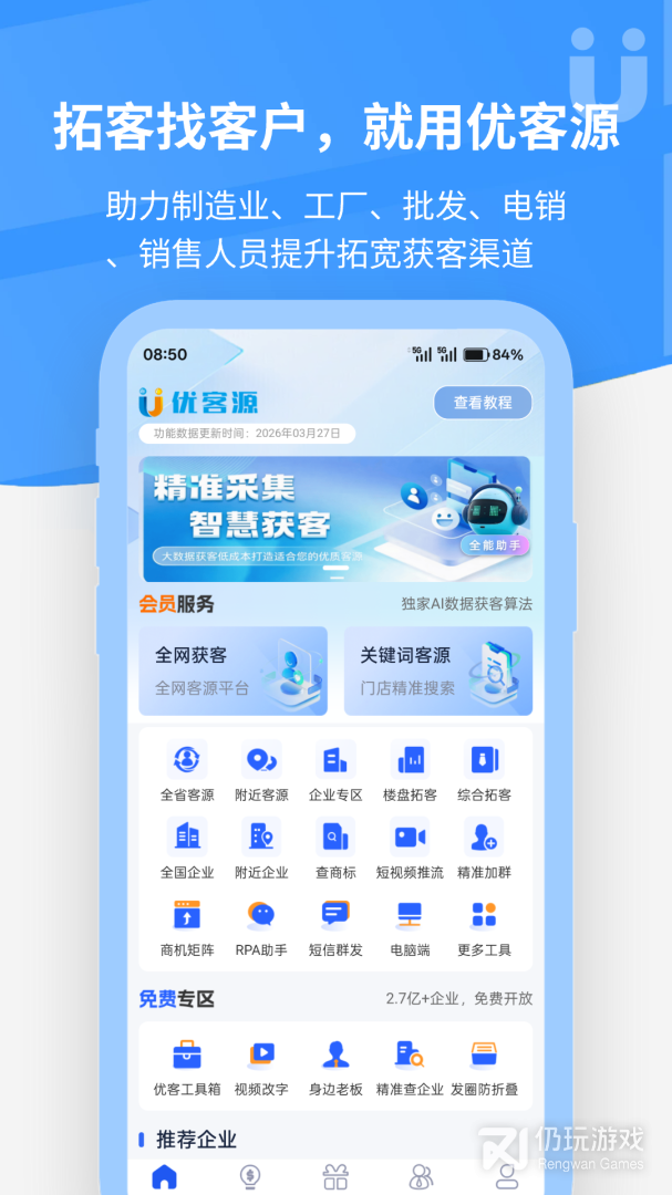 2、企业办公必备的小神器,优客源。软件的功能非常强大,可实现寻找优质的商家、客户数据、客户管理、精准采集等功能,软件里面包含了很多客户资源,用户可以在里面寻找顾客,适用范围广,营销效果强悍。软件能够帮助企业更好去进行维护,软件的管理方式优质,并且还可以通过这个软件来管理客户,能提高用户的工作效率