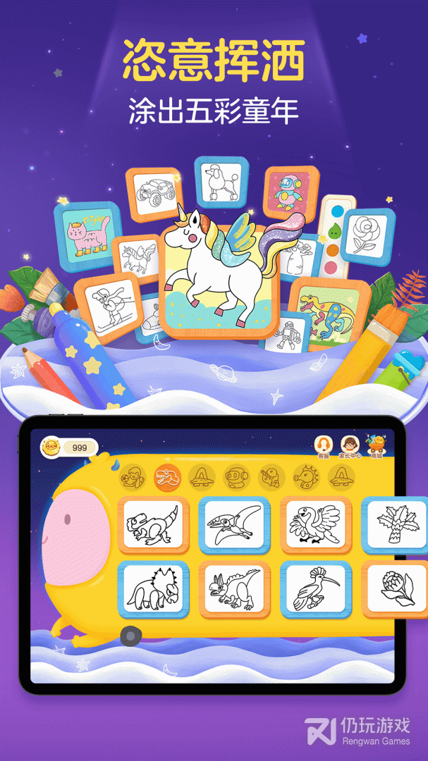 2、儿童绘画美术启蒙工具,这是一款少儿美术画画涂色软件,适合学龄前后的宝宝,尤其时幼儿园阶段,宝宝正是对于色彩感兴趣的时候,培养孩子对于色彩的撒配敏感性,也可以解放出家长的双手