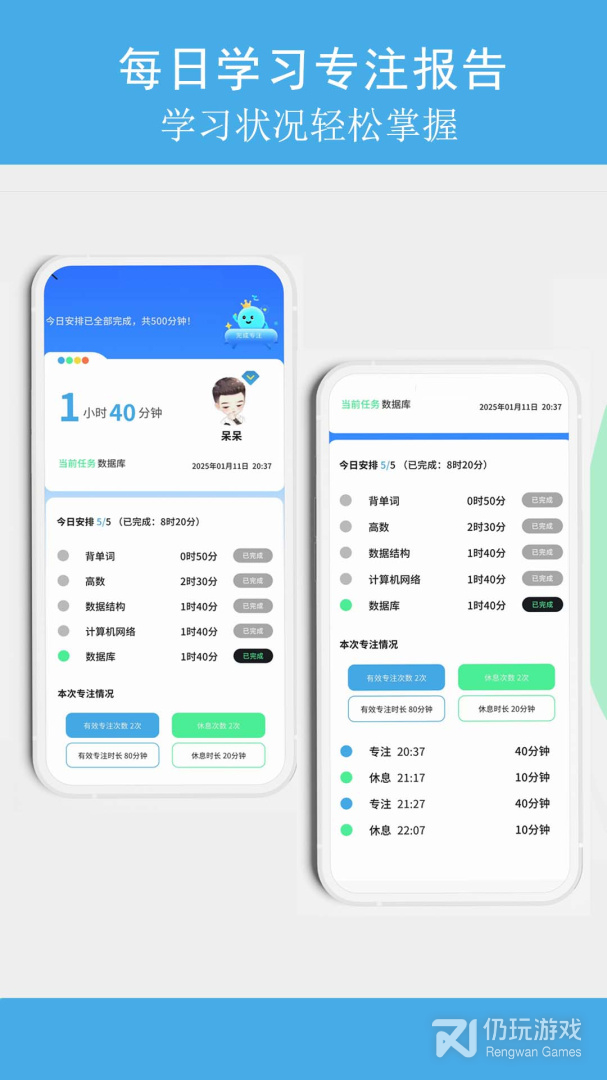 5、自习室,轻松应在学习气氛。学习状态(锁机状态、专注数据、白名单app运行状态)的公开展示,深层模拟真实的学习氛围