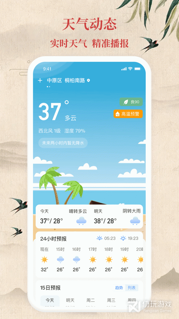4、小时天气预报:未来24小时天气的温度变化、晴雨趋势、每日温差、空气质量、风向风力一目了然,未来2小时暴雨等特殊天气提醒,为您出行保驾护航