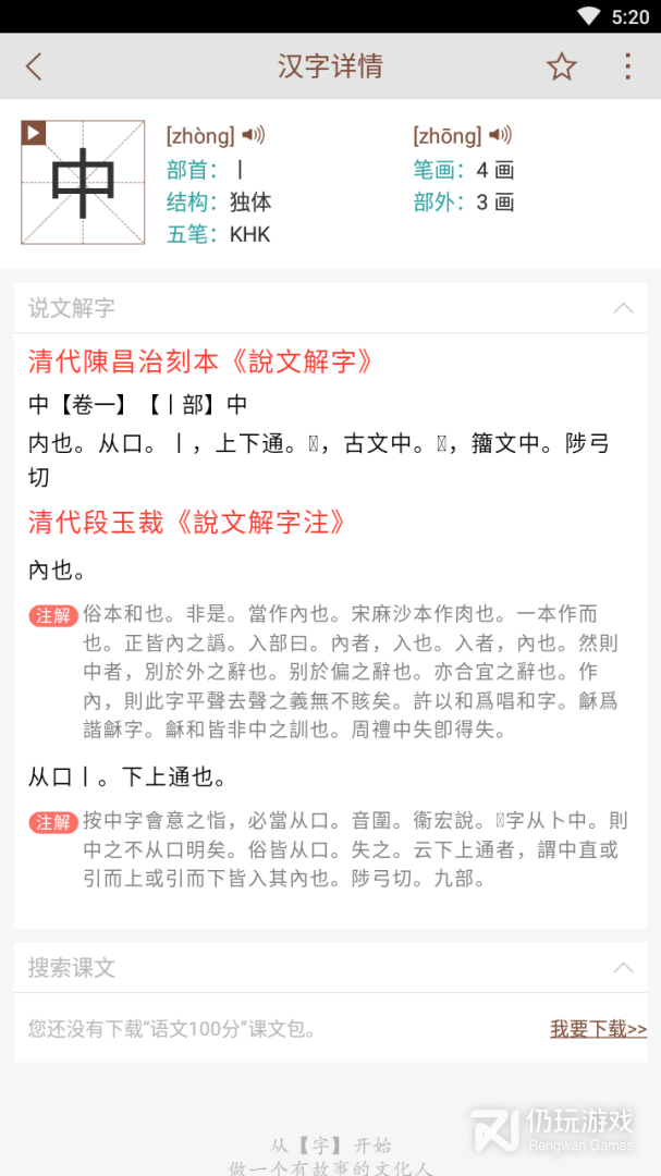 4、文字下方是清代陈昌治刻本说文解字的文字注释原文,软件加入了现代译文,一举两得