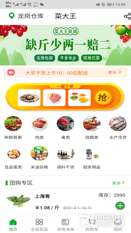 新鲜蔬菜、肉类、禽类、烧腊类、水产冻货、豆品蛋类、米面粮油、调料干货、新鲜水果,都可以通过APP购买