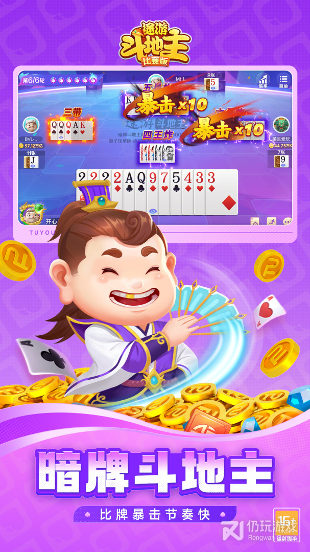 百万金币送不停!真人PK,公平竞技!玩法精彩刺激,牌友配合默契。让你尽享打牌乐趣,斗得过瘾,赢得畅快!