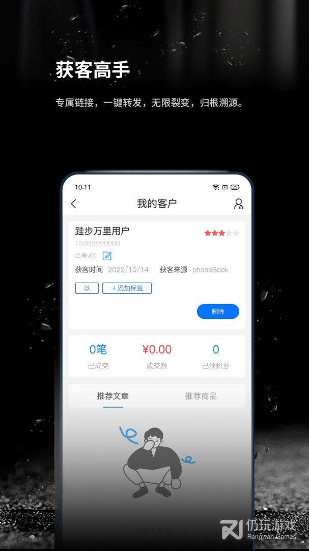 3、跬步万里还有强大的客户管理功能,所有客户都可添加标签,比如潜在客户、待发展、待维护等,客户的联系方式和意向都可以实时查询。另外,软件还提供了推荐文章和推荐商品,可直接分享给客户哦