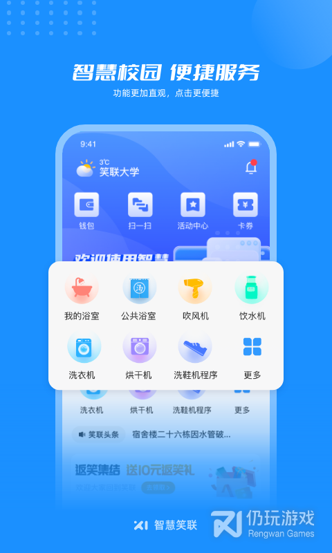 1、软件功能强大,可以推动校园后勤服务,有着丰富的功能,包括热水、洗衣、饮水、吹风、空调等,联通校园生活服务