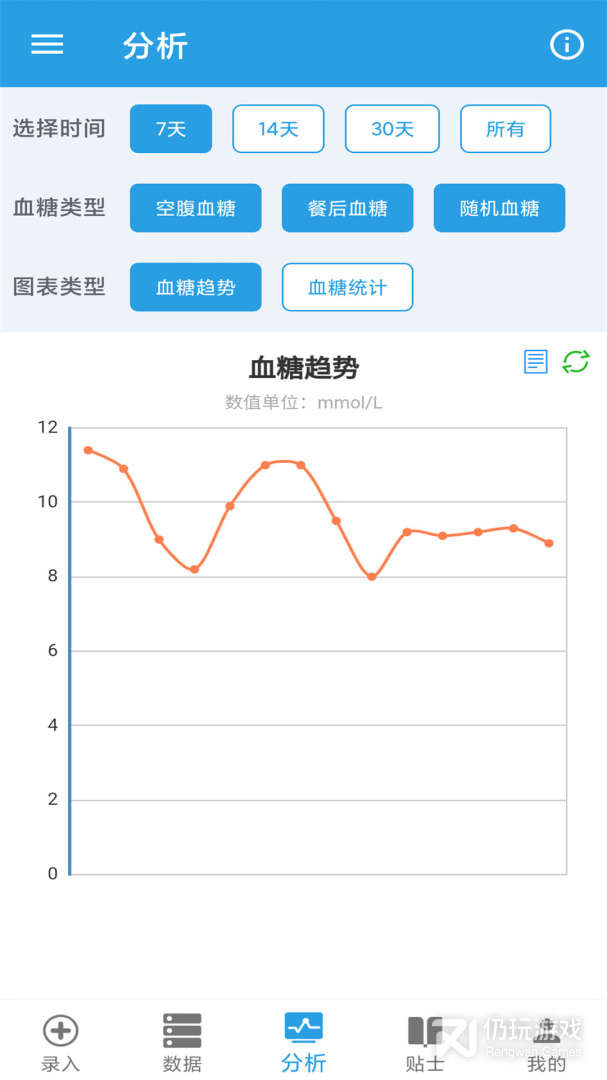 3、生成图表分析:通过生成直观易懂的图表,用户能够一目了然地了解自己的血糖记录、趋势和统计,轻松掌握自己的血糖问题