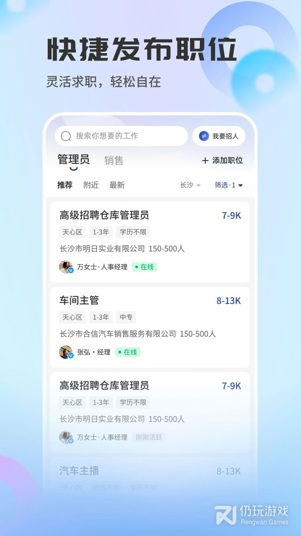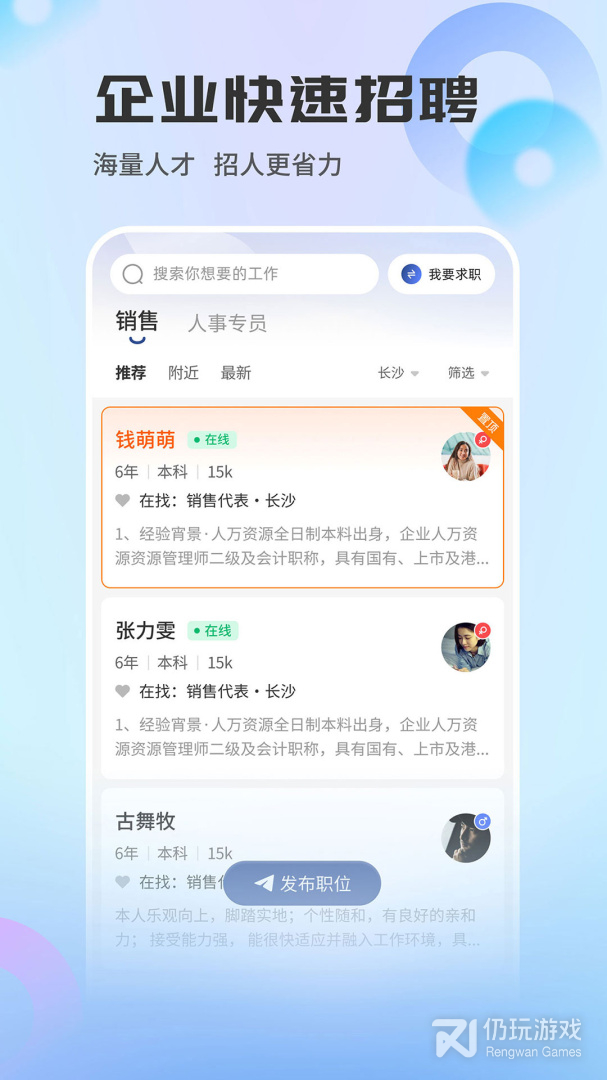 2、让更多找工作的用户轻松实现入职,找到自己心仪的职位;用户可以在app中浏览所有的招聘信息,找到合适的工作岗位,解决求职难题,智能为用户进行职位的匹配,根据用户需求来推荐合适的职位信息,轻轻松松找到好工作