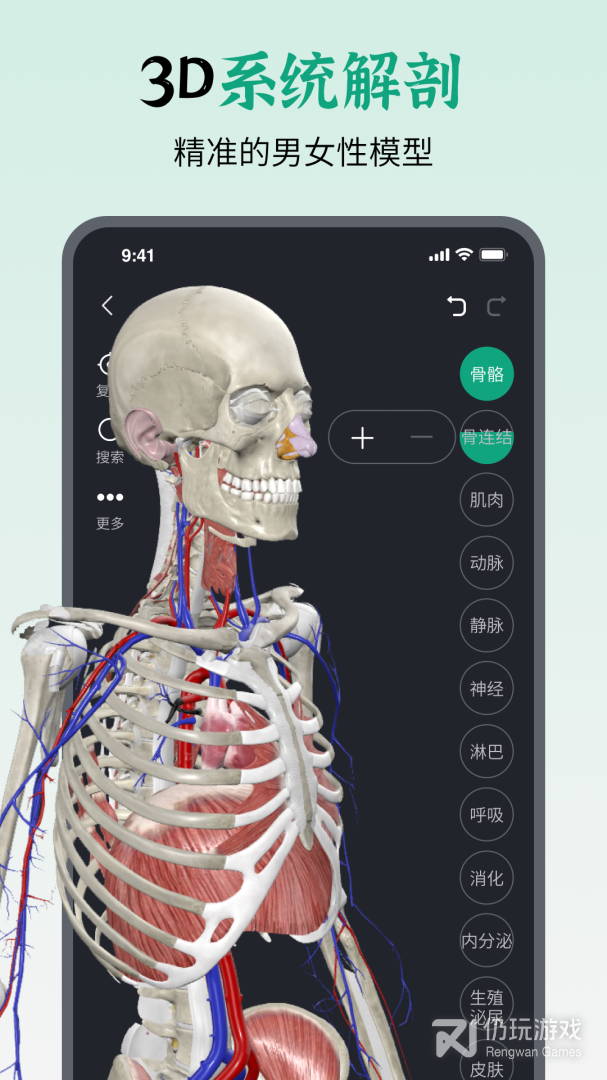 1、高清的3D人体模型,支持触摸和手势控制操作,帮助用户更快、更全面的学习人体解剖结构