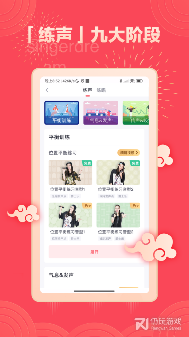 3、现代流行唱法声乐课程科学系统的为您解决高音上不去、低音下不来、气息不够用、音色不好听、唱歌容易累、感情不到位、五音不全等问题,用户在上传歌曲的同时,也可写下演唱歌曲时的疑惑或者有困难点,导师会针对性的向学员推荐改进声音状况的练习,包括气息、发声、传声、咬字等方面。不同于传统的图书、光盘、网络视频等介质