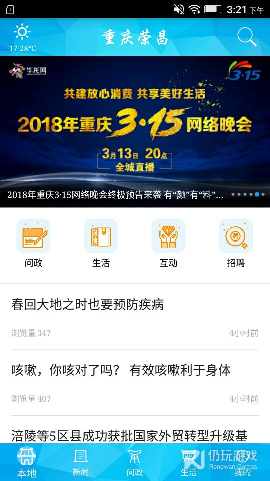 重庆荣昌APP由重庆市荣昌区委宣传部主办,以国际国内、重庆和荣昌多方资讯为主,整合网络问政、荣昌旅游、中国网事等资讯内容,开设水费电费气费、违章查询等便民项目,为网民提供更为方便快捷的服务;支持个性化订阅、高速浏览、网络问政、活动参与等功能,提高政务服务互动性与便捷性,拓展政府服务渠道,全方位满足各个层次用户需求。