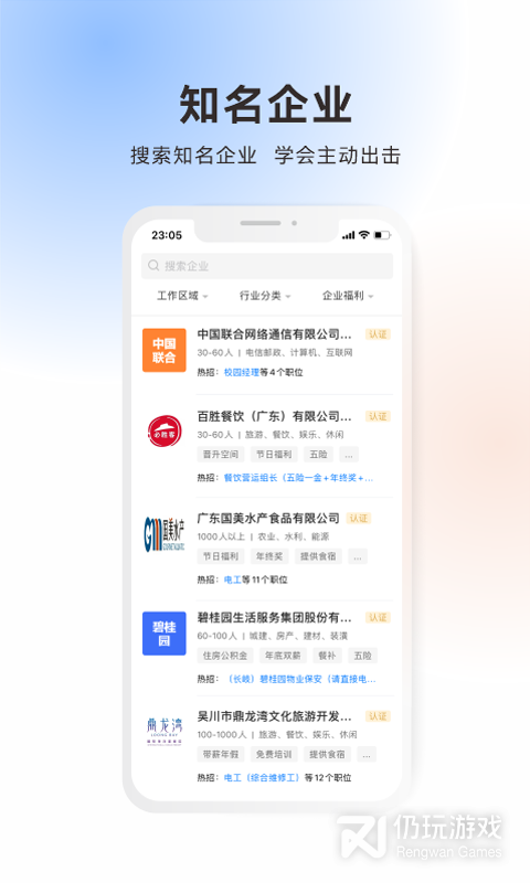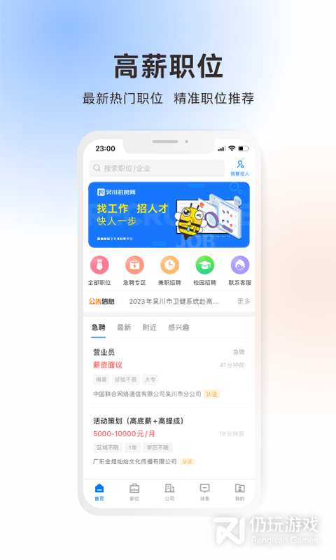 2、吴川招聘网是款专门为吴川地区的用户们打造的本地招聘服务软件。在这里可以随时搜索职位、企业,拥有全部职位、急聘专区、兼职招聘、简历中心和联系客服等服务,随时了解公告信息,从多方面促进找工作、招人才效率,操作简单,方便快捷,非常好用