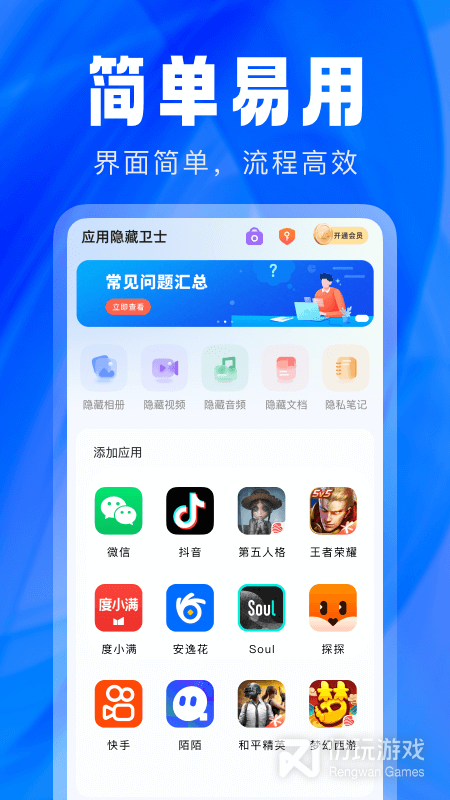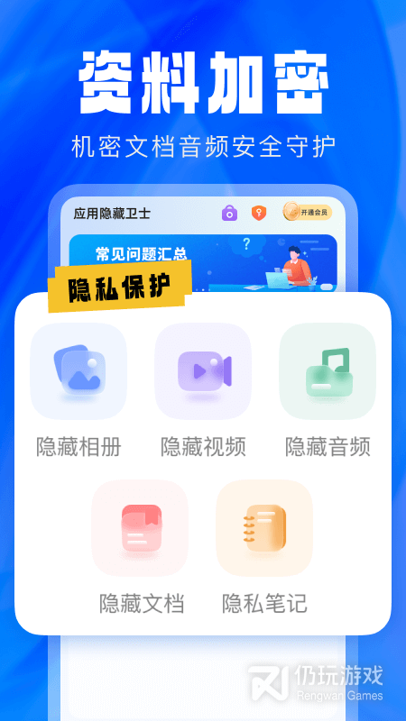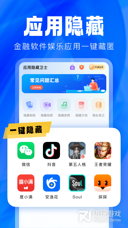 1、应用隐藏卫士最新版,是一款专业的应用隐藏软件,该软件当中拥有多种强大的实用功能,分别是更换图标、隐藏相册、隐藏视频、隐藏音频等,能够满足用户多种不同的使用需求