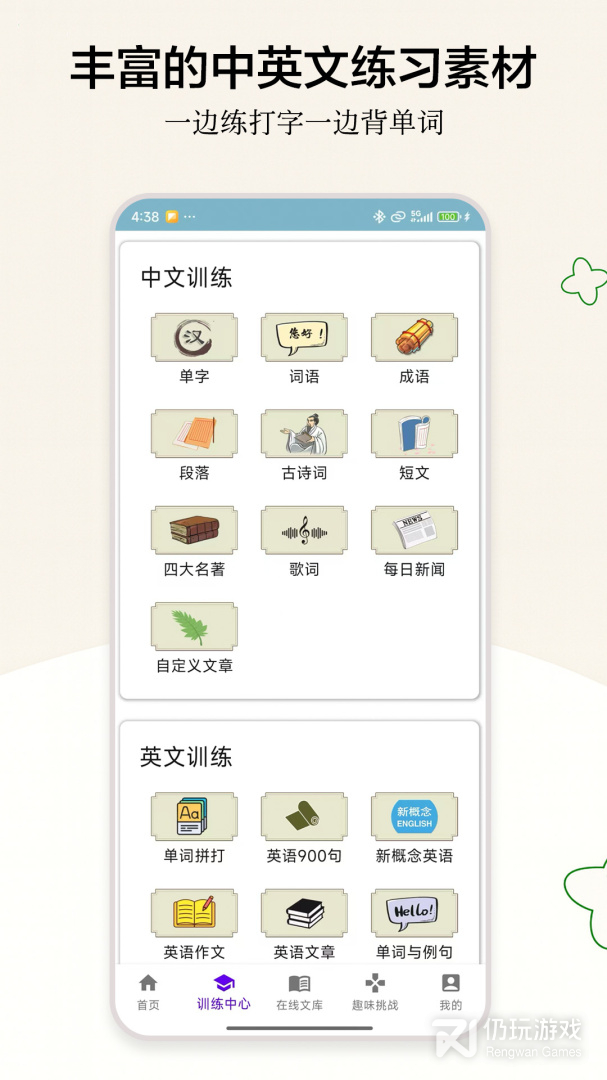 1、打开软件,可以看到软件可以进行中文训练、英文训练以及专项训练等,这里小编选择了中文训练