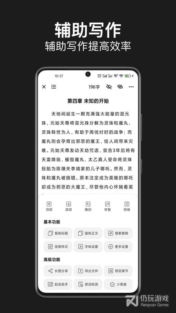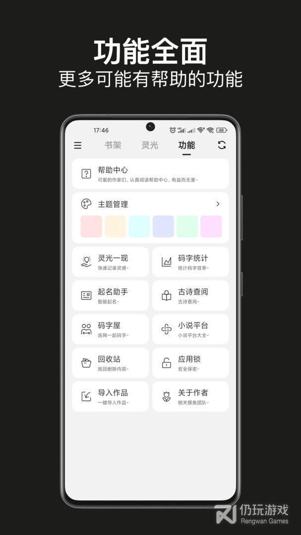 写小说、写大纲、灵光一现、起名助手、古诗查阅、码字屋(开发中)、回收站、查询小说平台、效率统计、云存稿等功能