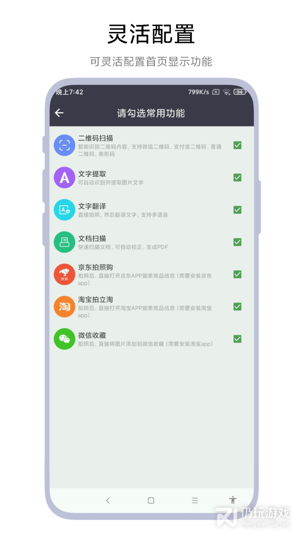 这是一个功能强大的扫描工具类APP,目前支持:扫描文档并自动校正、离线识别二维码、扫描图片并提取文字、扫描文字并自动翻译、拍照识别商品信息,拍照添加到微信等。另外,软件支持个性化显示,用户可以自由配置常用功能到首页。