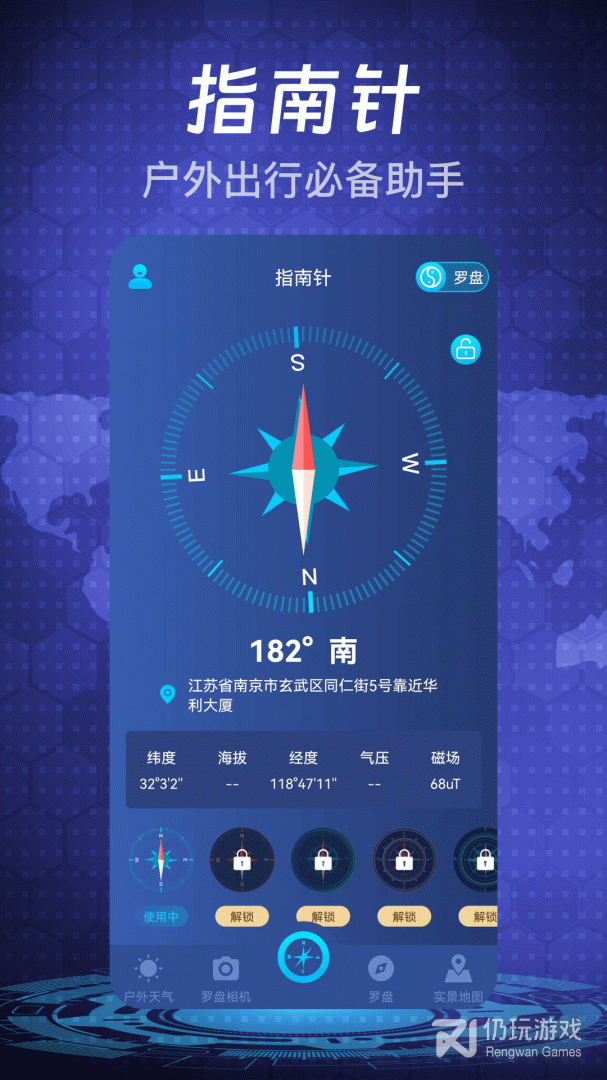 【户外指南针】支持海拔、气压、磁场强度、实况天气等专业户外指南针功能;