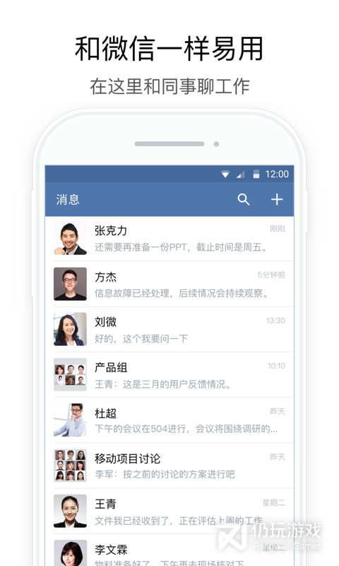 2、免费网络通话,图文、消息、位置、名片等发送,工作群组、电子通知,即时沟通提升办公协作效率