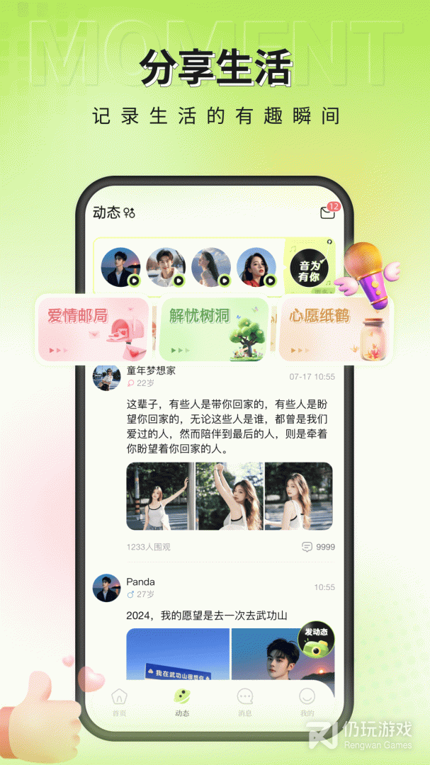 2、分享好听的声音、自拍的靓照、精彩的瞬间,总有懂你的一个陌生人。更有征婚专区、许愿专区、树洞专区等你探索