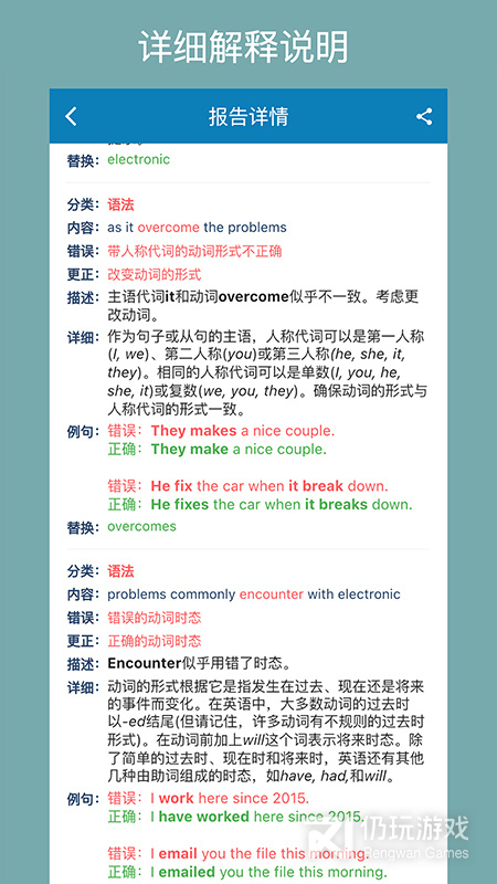 3、完美的解决了英语学习中遇到的口语书面语中的语法问题,智能纠错并提供正确的用法,在学习英语的朋友们一定不要错过了