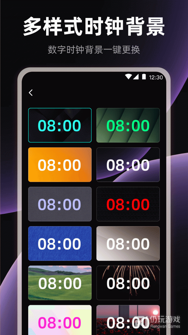 1、桌面全屏时钟App为用户提供了很有意思的桌面时钟,这里的时钟款式多样,数字时钟、计数器时钟、罗马时钟等等,用户可以自由选择喜欢的一个款式。哪怕选择了最为简单是数字时钟也能自定义皮肤色彩,给它换上自己的专属颜色,还能够自由调整时钟的字体大小