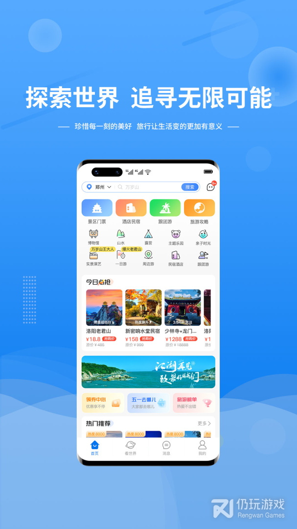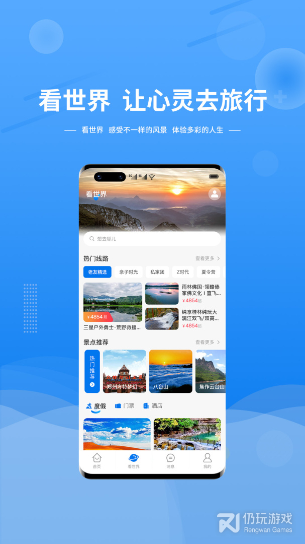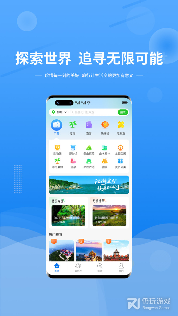 这是一个能够查询各地的旅游线路和购买跟团游、自助游、定制游、游轮、门票预订等平台,同时也能发布自己的旅游日记,晒出自己的生活和查看热点旅游推荐的移动APP。
