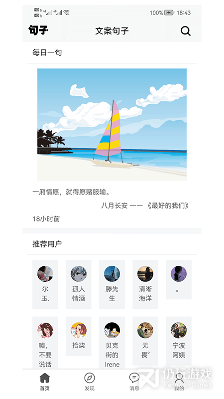 1、文案句子软件让你和众多同好一起交流,在这里有非常多的名言句子,你可以根据你的想法来搜索查找,在这里你还可以自己发布觉得非常好的句子,可以拿来做个性签名发朋友圈文案等等