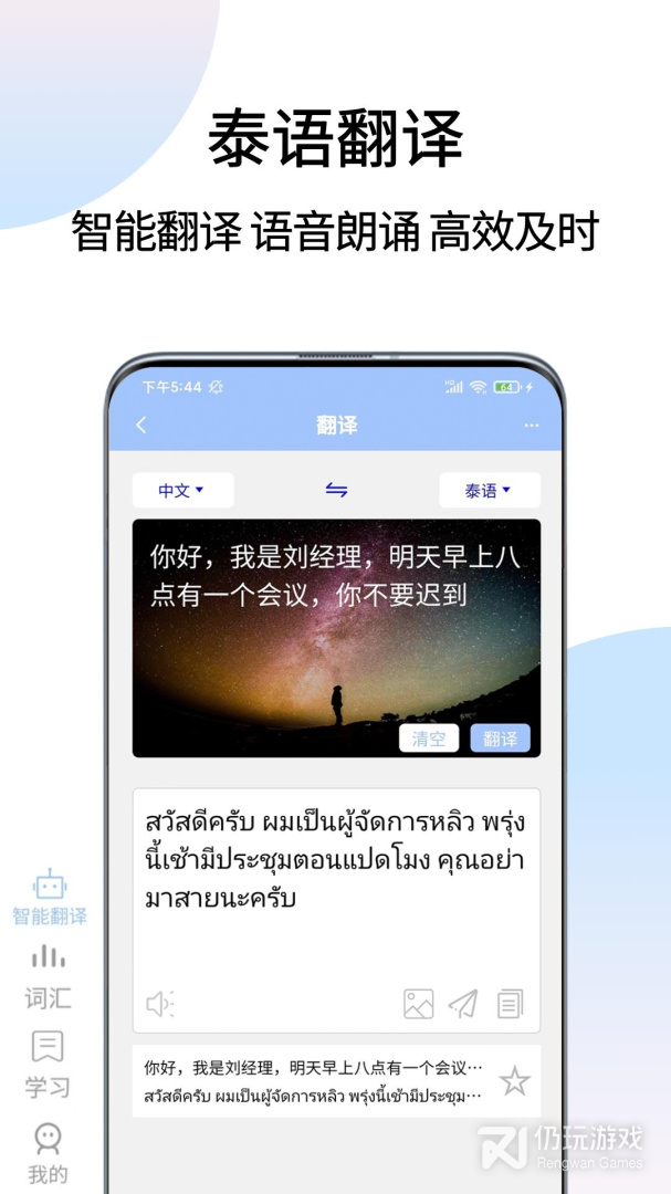 支持词语、句子、短文等文本的输入即可快速翻译,是您超快学习泰语泰文的好帮手!