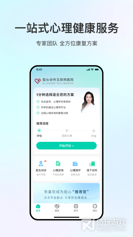 3、观心实验室app是一个专门为人们提供精神卫生和心理咨询服务的软件。它的主要功能包括了:心理测评、在线咨询、心理课程等多项服务。它可以有效地帮助用户对自己的心理状态有一个全面的认识,并向他们提供个性化的、专业的咨询服务,从而进一步提高他们的心理健康水平