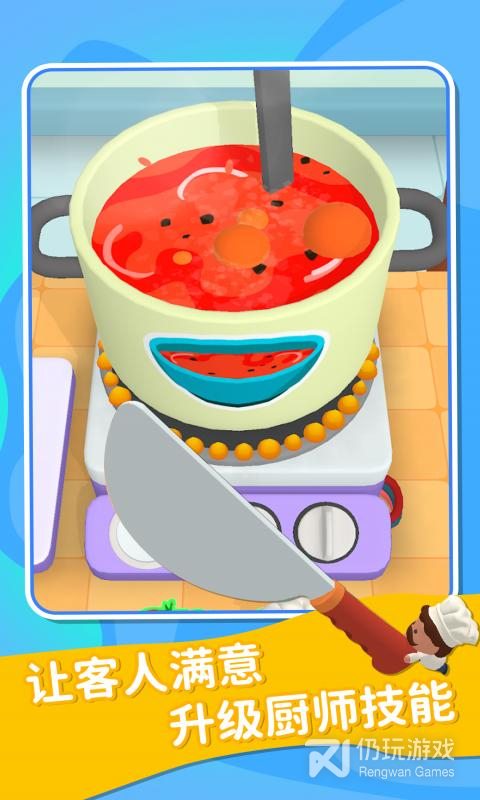 2、卡通游戏场景画面,简单灵活的操作玩法规则,在小小厨师中,玩家将扮演厨师长,经营餐厅,制作美食,满足顾客的需求,游戏内容丰富