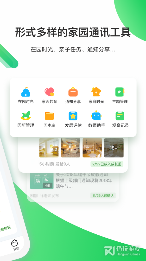 通过在园、家庭时光,让家长、老师随时了解孩子在园及在家的教育动态,保持家园教育信息同步,增强家园有效沟通。
