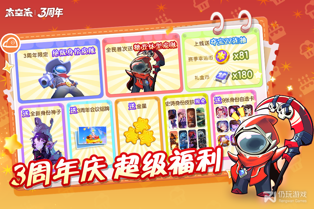 12月5日起,登录送夺宝22连抽、海量金星和限定身份皮肤!新身份神子整顿太空杀,体验全史诗身份皮肤畅玩,送新身份和糖豆体型皮肤!还有3周年限定铭牌、永久身份自选卡和豪华回归奖励等你来拿!