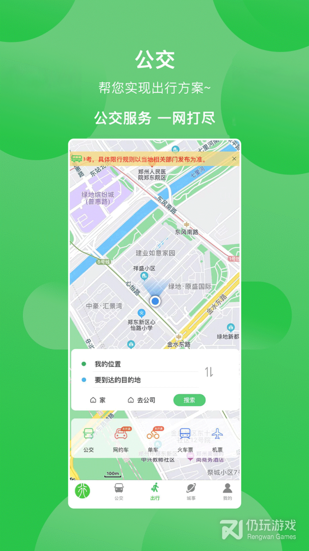 用户可以在此页面输入自己的位置以及目的地,就会自动生成出行方案和路线,也可以进行网约车、单车服务,还可以进行火车票、机票的购买。