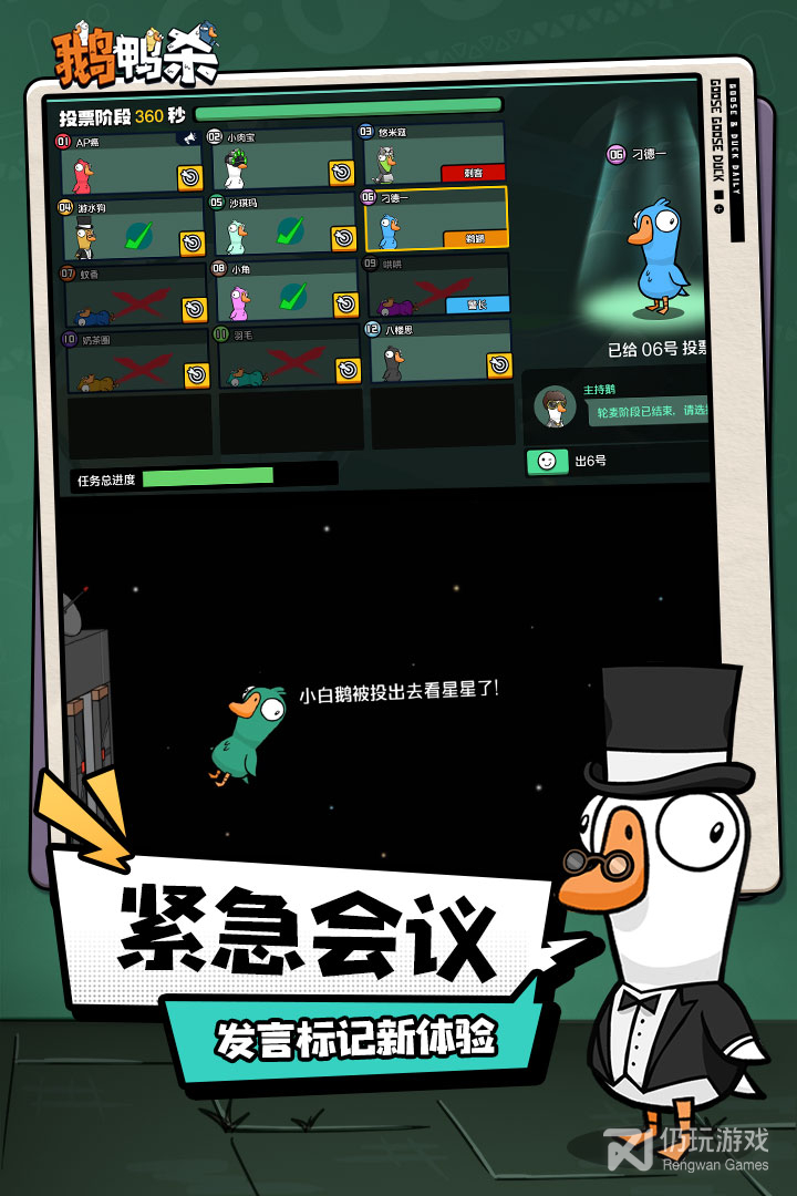3、鹅鸭杀国际服是鹅鸭杀国际服本,是一款以鹅和鸭子为主角的狼人杀游戏,与众多的玩家进入到飞船开启狼人杀挑战,不同的身份对应着不同的阵营,找出内鬼并杀死,隐藏好身份获得胜利