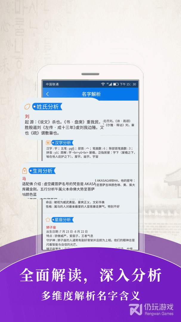 3.姓名评测,八字评测,汉字读音笔画五行属性查询,数理资料和三才资料阅览等功能。