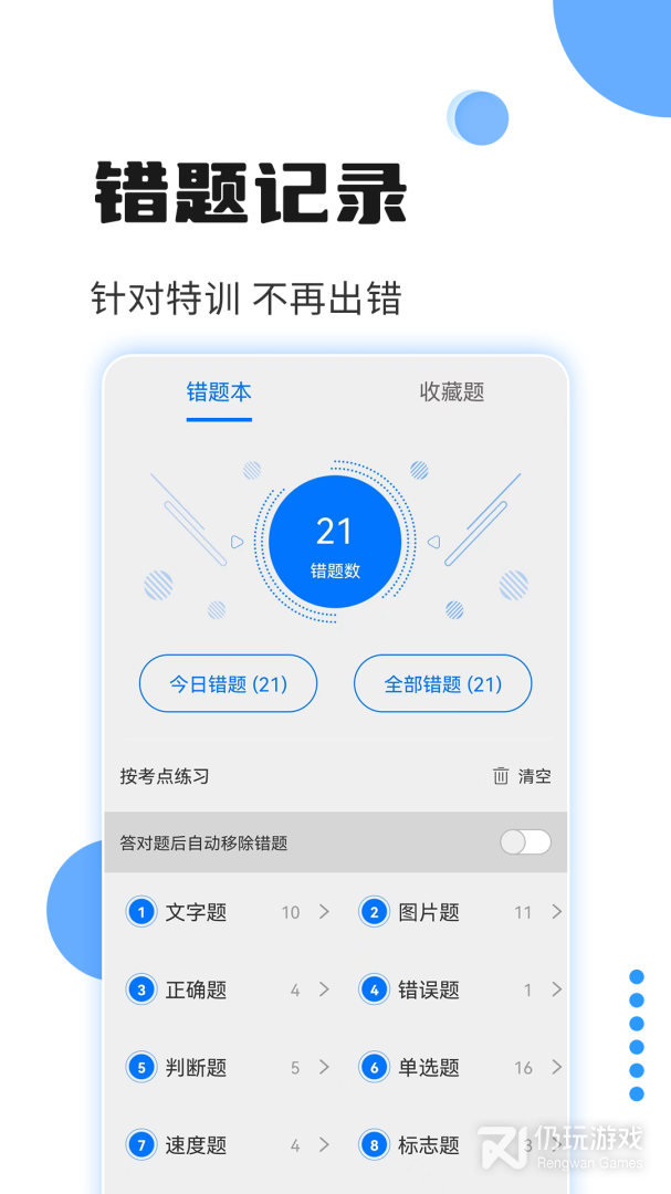 1、当用户使用驾照考试宝最新版刷题时做错题目,错题会自动进入错题本,用户可以反复练习错题本里的题目,了解错在哪里,补充相关的知识,知道错题没有,全部答对,这样可以更好的应对考试