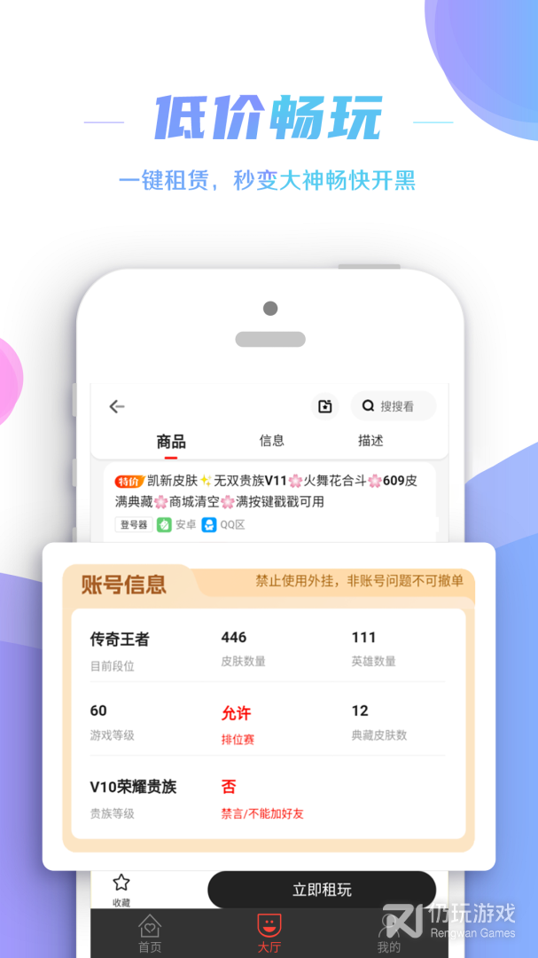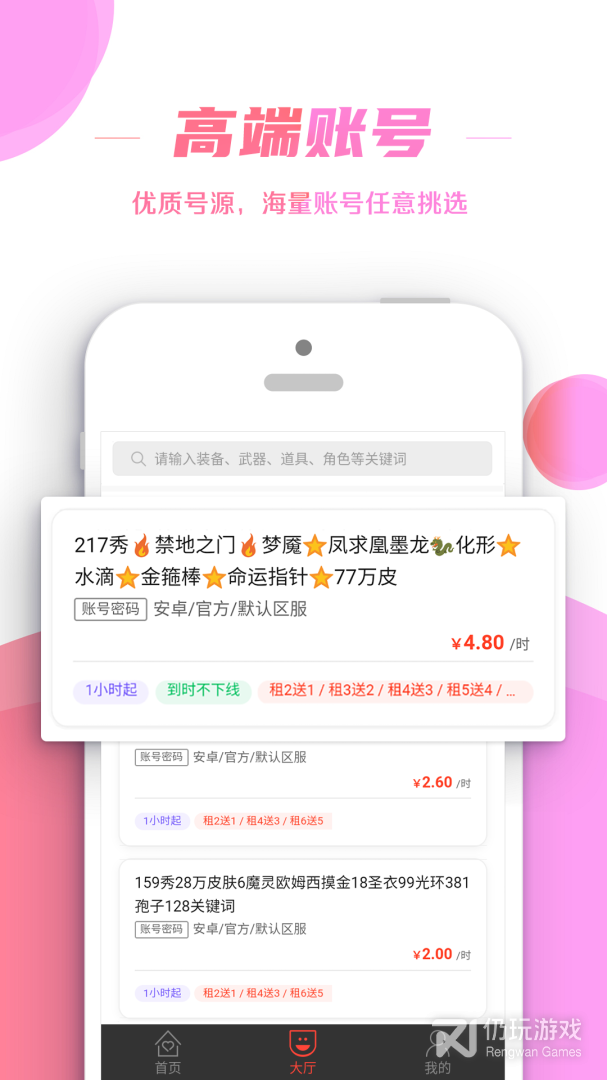2、可以轻松租号的租号控APP非常便捷实用,这里有海量的游戏账号任你挑选,所有账号绝对都是非常安全可靠的,端游手游账号全部覆盖在内,大家可以根据自己的喜好随意挑选。平台内租号价格公开透明,下单之后就可以直接进行账号登录了,快来享受更好的游戏体验吧